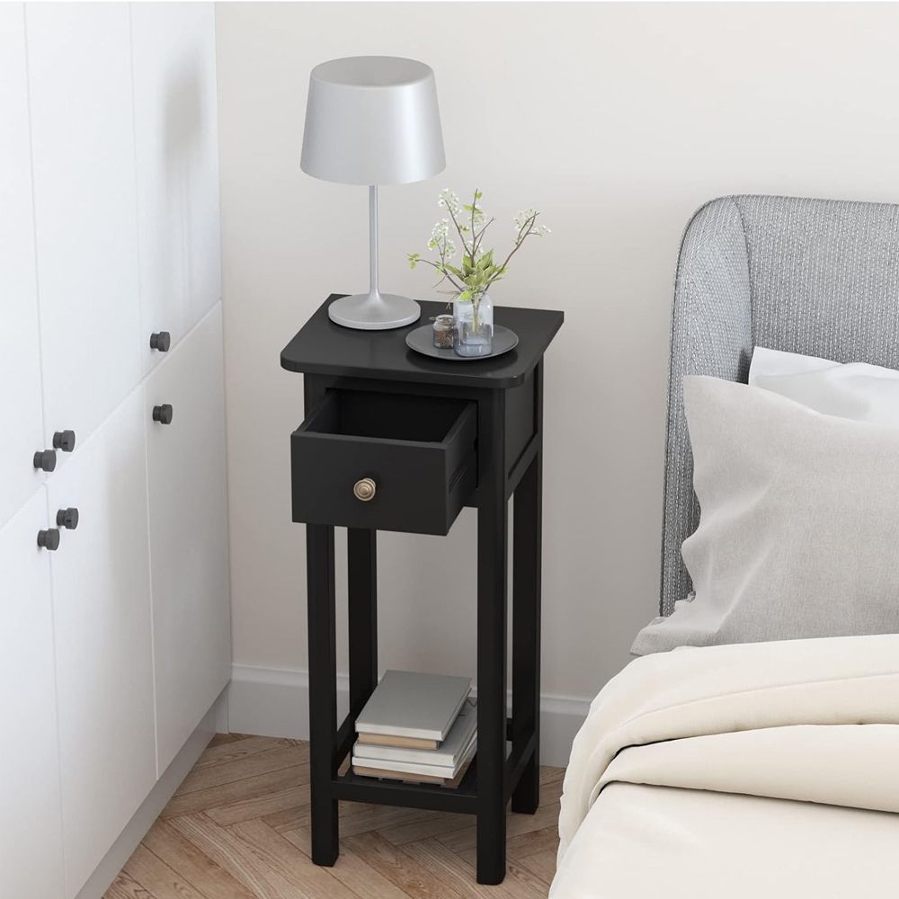 3.Extra Storage Space: Say goodbye to storage concerns! The spacious tabletop provides room for your cup of coffee or a lamp. The drawer not only adds a touch of elegance but also offers discreet storage for small items. Additionally, the open shelf is perfect for showcasing books or magazines, thus keeping everything you need within easy.