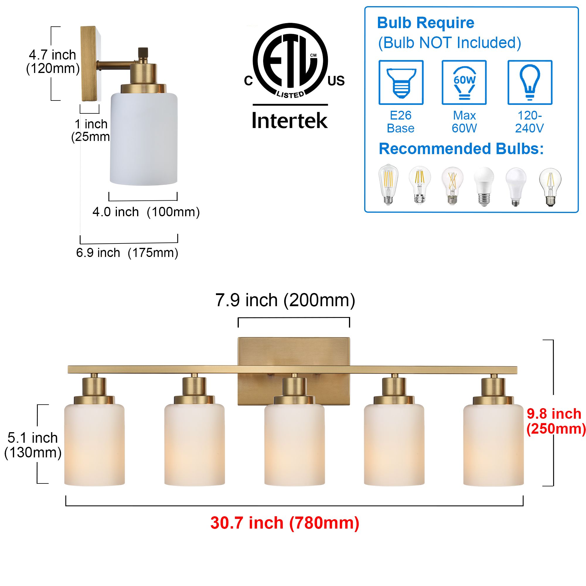 6 light bathroom lighting fixtures over mirror features a brushed brass metal finish, paring with milky white frosted glass lampshade to create a modern and exquisite look, and provide a soft and diffused lighting effect, it's simple but stylish, almost match with all your space decoration style, adding a touch of an modern and elegant charm to your bathroom.