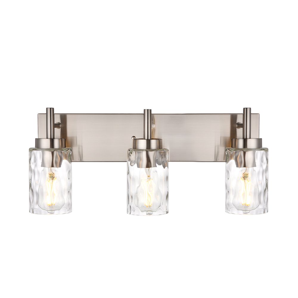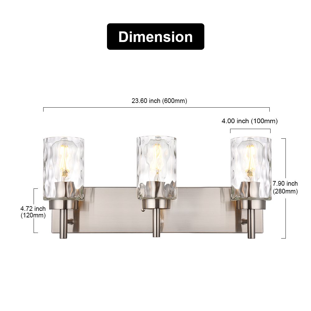 Modern & Unique Design:This 3-light wall vanity light fixture brushed nickel has clear hammered glass shades and a rich finish that creates a farmhouse look in your space.The glass shades bring a refined vintage feel to any room and simple yet elegant metal finish with clear hammered glass shades lends itself to placement in a bathroom, entryway, or dining room, bringing a modern farmhouse vibe to space.It can be mounted in the up or down position.