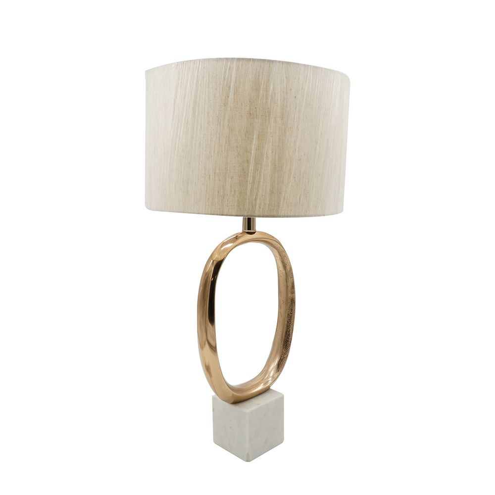 Showcasing the beauty of modern artwork, this decorative table lamp boasts a unique cut-out oval silhouette that is finished in metallic gold. Completing the visuals, an organic white marble base pairs with a beige fabric shade to create a strong, alluring contrast. Suitable for any home, this table lamp is an excellent option for an office, foyer, bedroom, or living room.