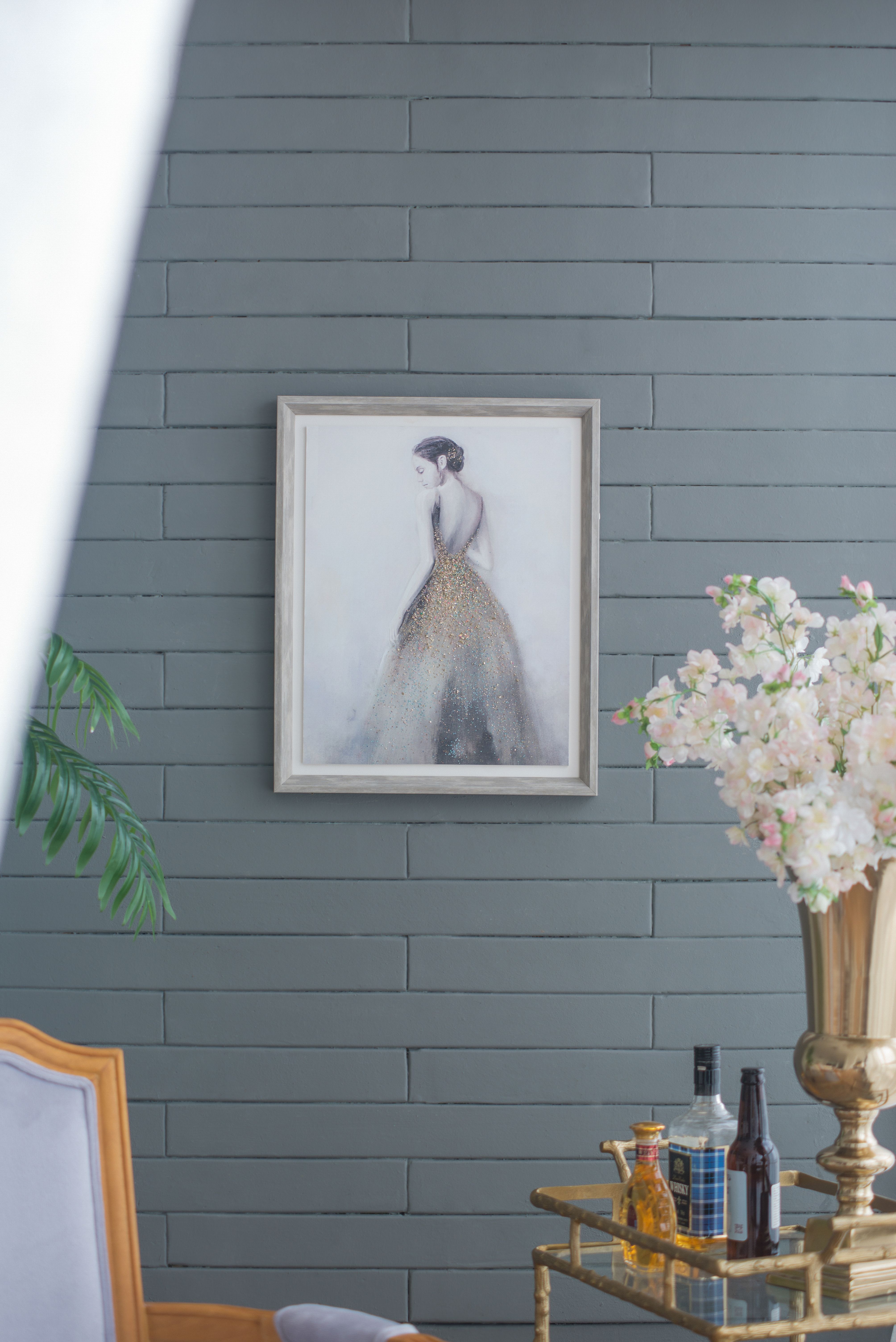 Features a sketch of a woman figure wearing dressGold accents to further enhance the artworkWith a soft wood color frame.
