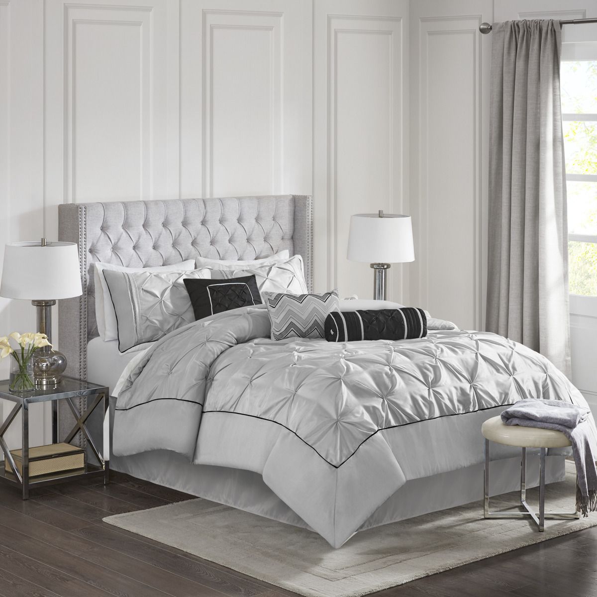 This beautifully tufted bed is from the Laurel bedding collection. Its grey coloring makes this set create a statement in your bedroom. The collection is made from 100% polyester polyoni and has pieced fabric sewn together providing added dimension. It is finished with a smooth edge of fabric that creates a beautiful border around this comforter. Items in the set may come in a rolled or compressed packaging, which will need to be fluffed up or steam ironed before use to remove wrinkles.
