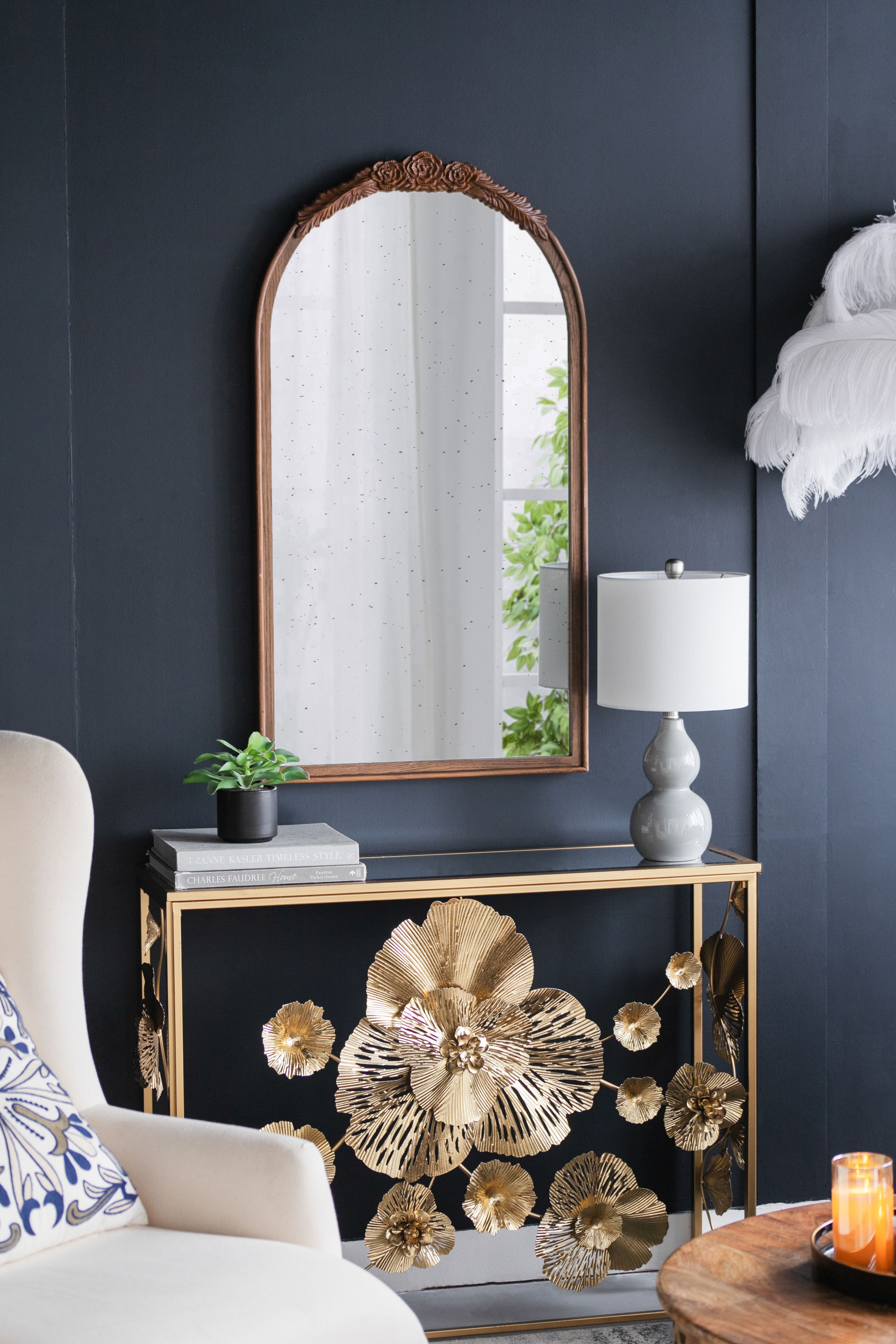 Taking a timeless silhouette and transforming it into a new modern classic, is exactly how the Bingley Mirror is designed. A hand carved rose embellishment on the top arch of the mirror extends outwards to line the top of the mirror, to encase a subtle antiqued mirror. Combined with the neutral brown coloration of the frame, the Bingley Mirror is the perfect addition to any classic design.