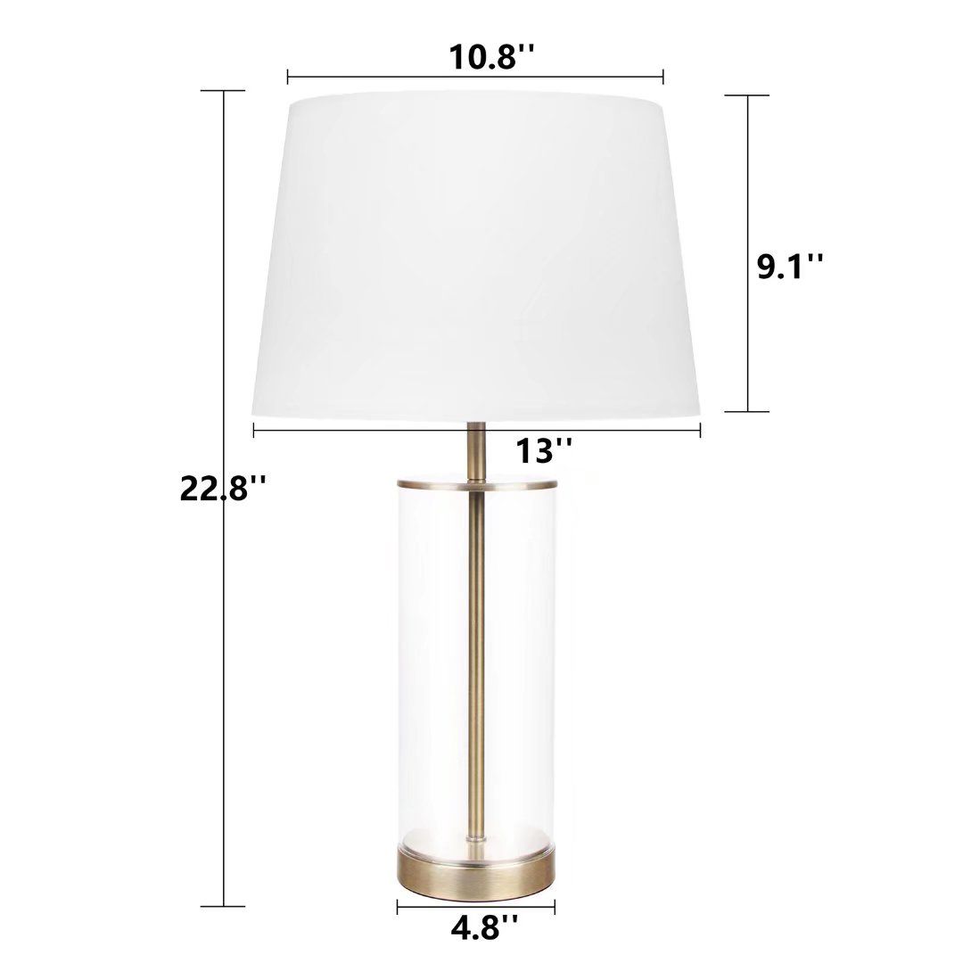 This classic table lamp with clear glass base can be used as a stylish room accent or customize the look by filling the base with your favorite decorative objects. The lamp base opens; allowing you to fill the glass base with any decorative object of your choosing; such as flower petals; shells; seasonal decorations; corks or even colored sand - the possibilities are endless! A crisp white fabric shade sits on top and a elegant brass finish accent draws the look together in contemporary transitional style.