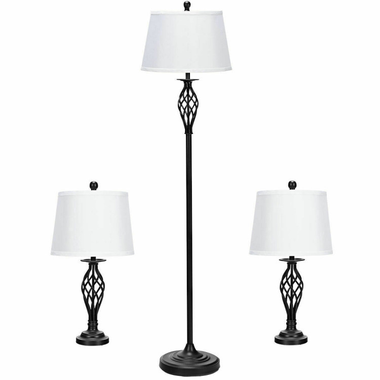 2.Durable and Stable Construction: Our Tangkula 3-piece lamp set includes two matching table lamps and one floor lamp. Constructed by antique bronze finish base, metal construction and white fabric shade. Each lamp uses one maximum 60 watt standard-medium base bulb (not included). Table lamp shades are 8" across the top x 10" across the bottom. Floor lamp shade is 12" across the top x 15" across the bottom x 10" high.