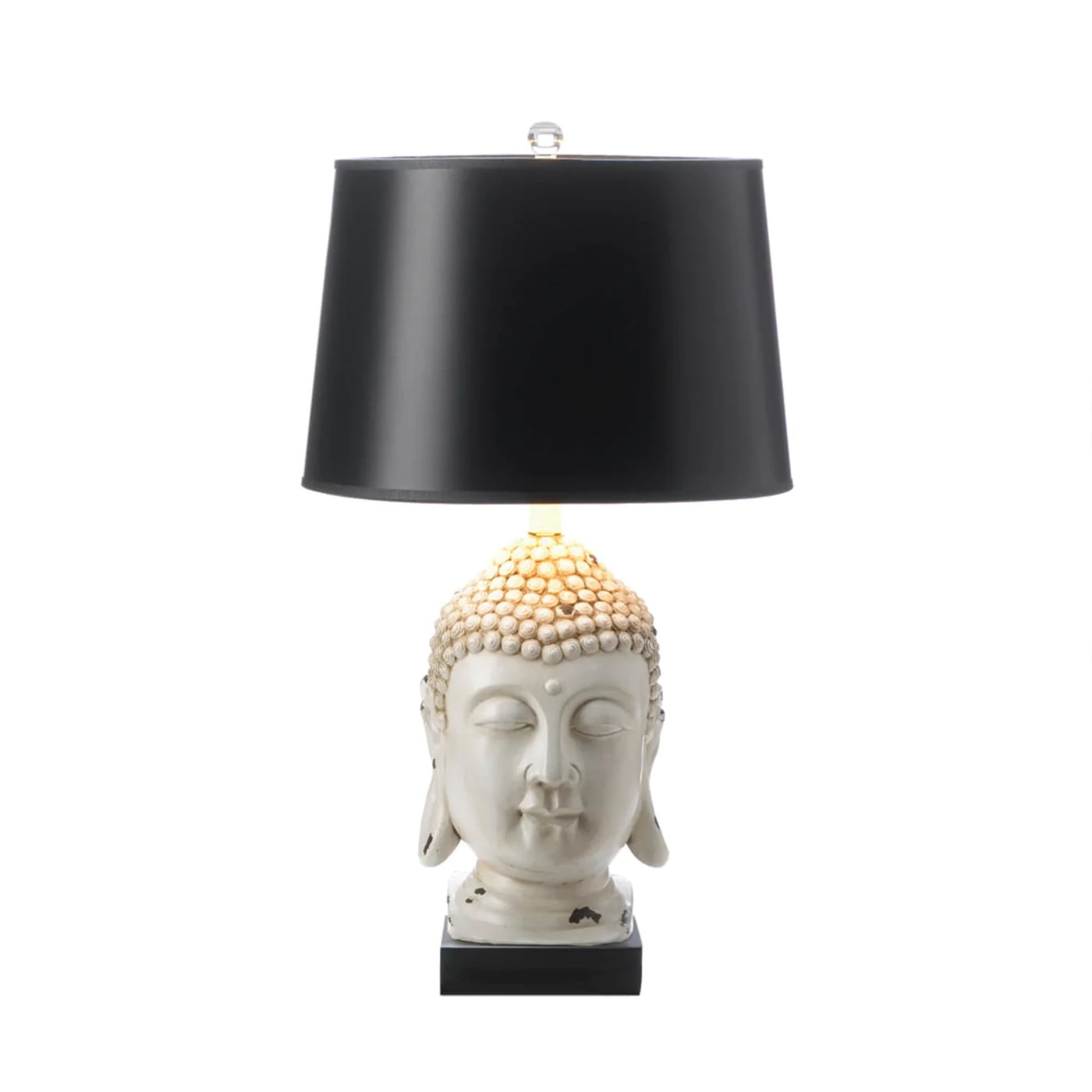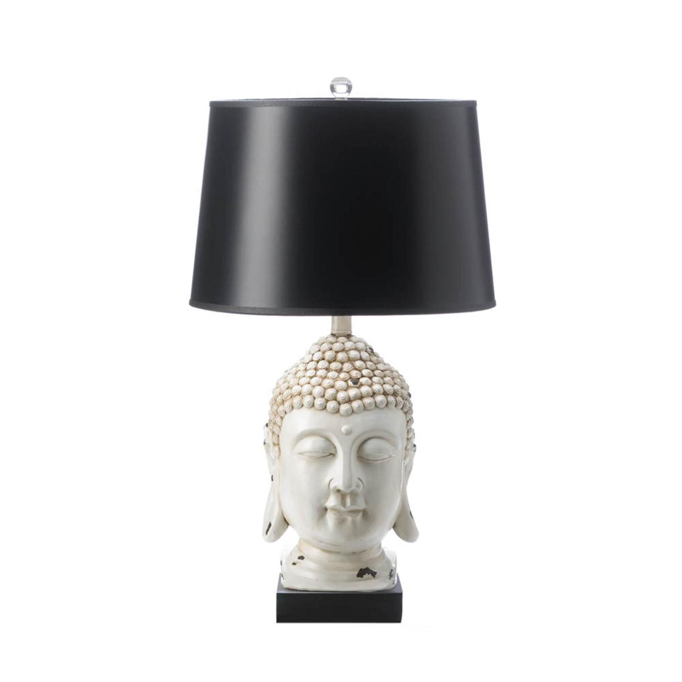 Create your own oasis with the Laos Buddha Table Lamp. Perfect for adding a touch of Zen to your everyday space. ||Buddha head base in a rustic white finish. Black paper lamp shade. Clear acrylic lamp finial.