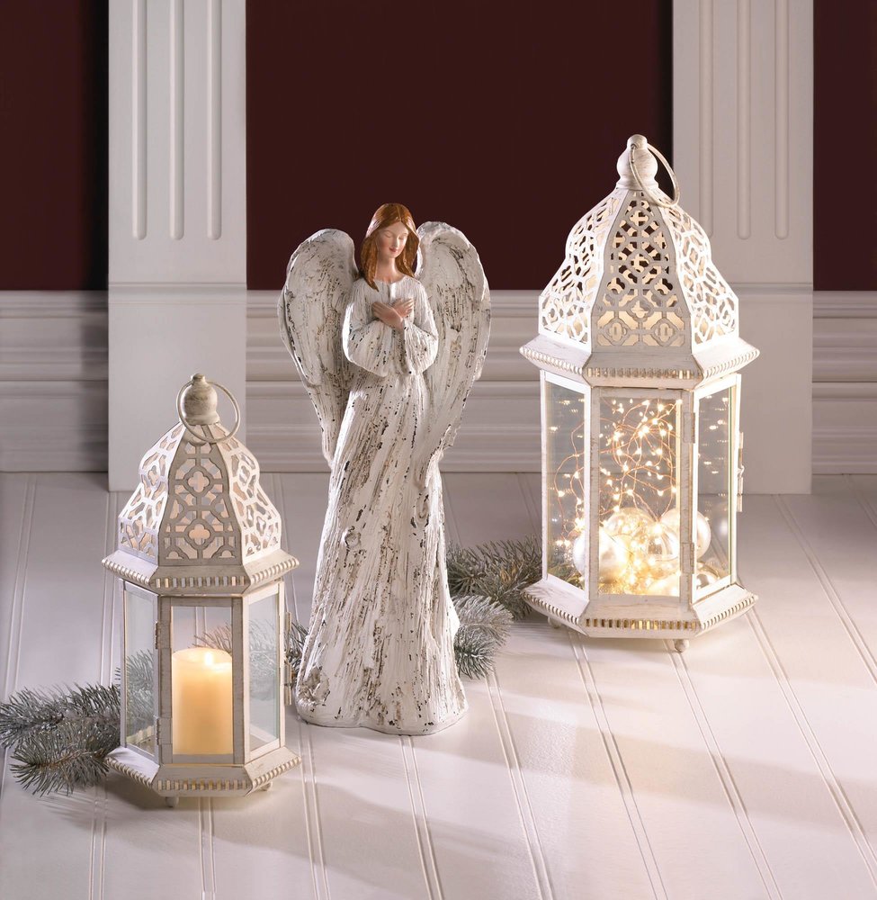 • Let candlelight steal the show with help from this exquisite lantern. The intricate cutout patterns in the iron frame are beautifully enhanced by a vintage white finish that's eternally stylish. Just add your favorite candle!
